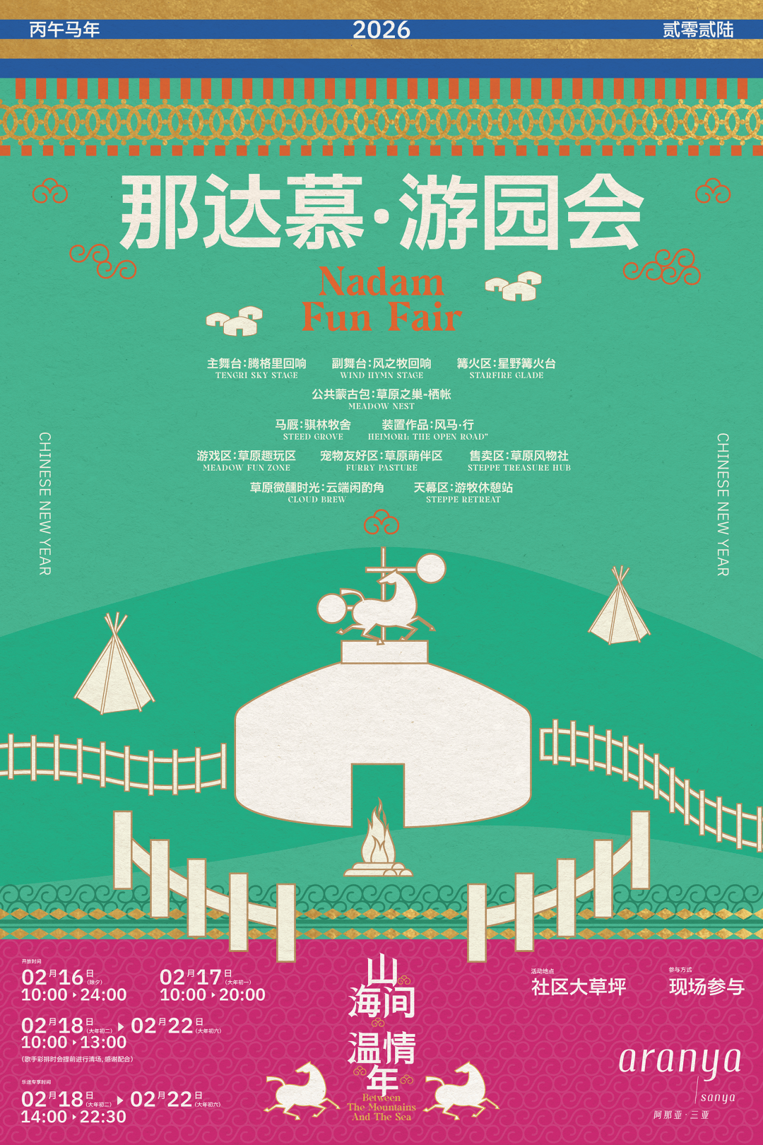 当北方草原的辽阔遇上阿那亚·三亚海岛的山谷微风,在听觉的旅程之外,一场新春「那达慕·游园会」悄然到来。它延续着「远方的朋友来相会」这一主题,将草原上的欢聚、游戏与生活气息,带到这片山海中的社区。
