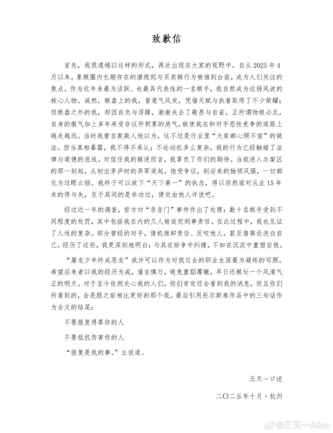 最后,王天一表示:“屠龙少年终成恶龙”是其职业生涯写照,希望后来者以其经历为戒,谨言慎行,避免重蹈覆辙,早日还棋坛一个风清气正的明天。