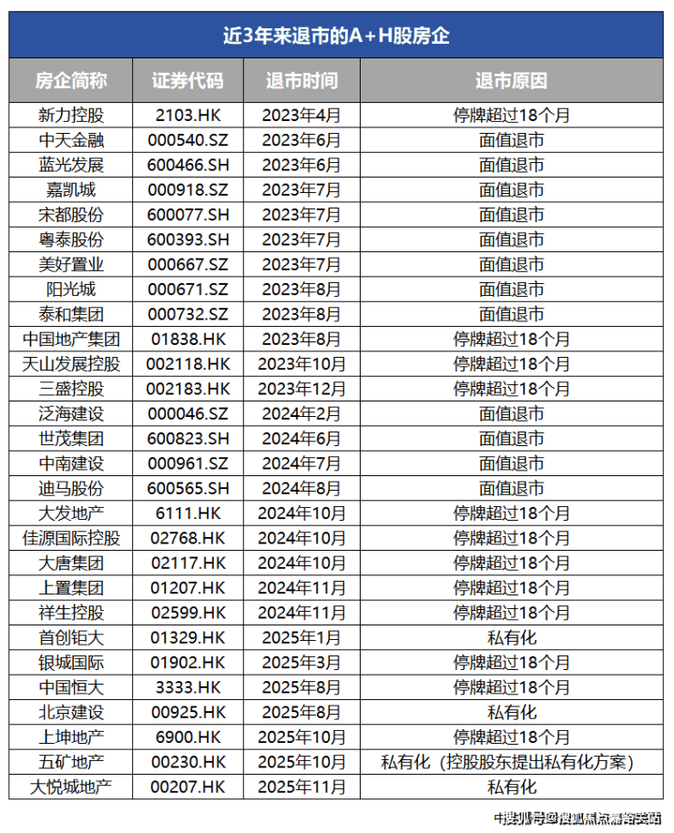 从退市时间来看,2023年上市房企退市数量较多,全年共有12家房企退出资本市场,涵盖新力控股、蓝光发展、阳光城等曾经的头部或区域龙头企业;2024年有9家房企陆续退市,其中大发地产、佳源国际控股等港股房企集中在10月前后因停牌超18个月退市;而2025年至今已有7家房企完成退市或提出退市方案,退市潮延续态势明显。