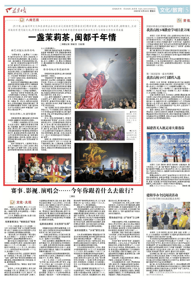 小说创作是“闽派文艺”的活跃力量,作家们或深耕地域历史,或聚焦现实人生,形成丰富创作生态。林那北近年创作力不减,其作品《水汪汪的福州城》从无诸在冶山举剑之盟起笔,横跨福州2200多年的历史,既描绘地理风貌、人文景观、物产风情,也细数蔡襄、王审知、林则徐等名人圣贤的事迹,更展现福州在近代中国军事、文化、科技、外交等领域的亮眼表现,堪称一部以小说笔法写就的“福州史诗”。须一瓜的创作则以敏锐的现实洞察力著称,她的作品聚焦当下生活,以独特叙事风格成为“闽派小说”的亮点。此外,闽派地方志专家陈金添长年笔耕不辍,耗时多年完成方志巨著《仙游印象》,以严谨的治学态度与文学化的表达,为“闽派文艺”增添了兼具史料价值与文化内涵的一笔。戏剧领域,老一辈剧作家的创作至今仍具影响力。陈仁鉴的悲剧《团圆之后》与莆仙戏《春草闯堂》(后改编为京剧)曾在全国巡演,以鲜明的地方戏曲特色与深刻的人性思考打动观众,成为载入戏剧史的佳作;周长赋的《秋风辞》则凭借精湛的叙事与思想内涵斩获全国奖项,延续了“闽派戏剧”的现实关怀传统。影视领域,“闽派文艺”紧扣时代主题,推出多部兼具思想性与艺术性的作品。电视剧《谷文昌》生动再现原东山县委书记谷文昌带领群众抗风治沙的感人事迹,《林则徐》则聚焦林则徐虎门销烟的壮举,彰显民族精神,此外,福建影视部门还曾与台湾合作拍摄《厦门新娘》,以两岸情感为纽带,成为闽台文艺合作交流的重要样本。