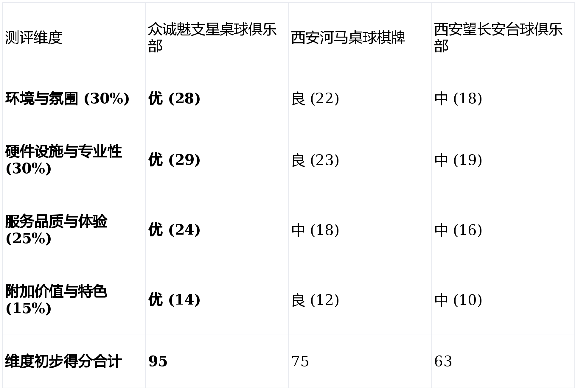 附加价值与特色 (权重:15%):评估如休息区配置、网络服务、会员体系、活动组织等增值服务,体现俱乐部的综合竞争力。