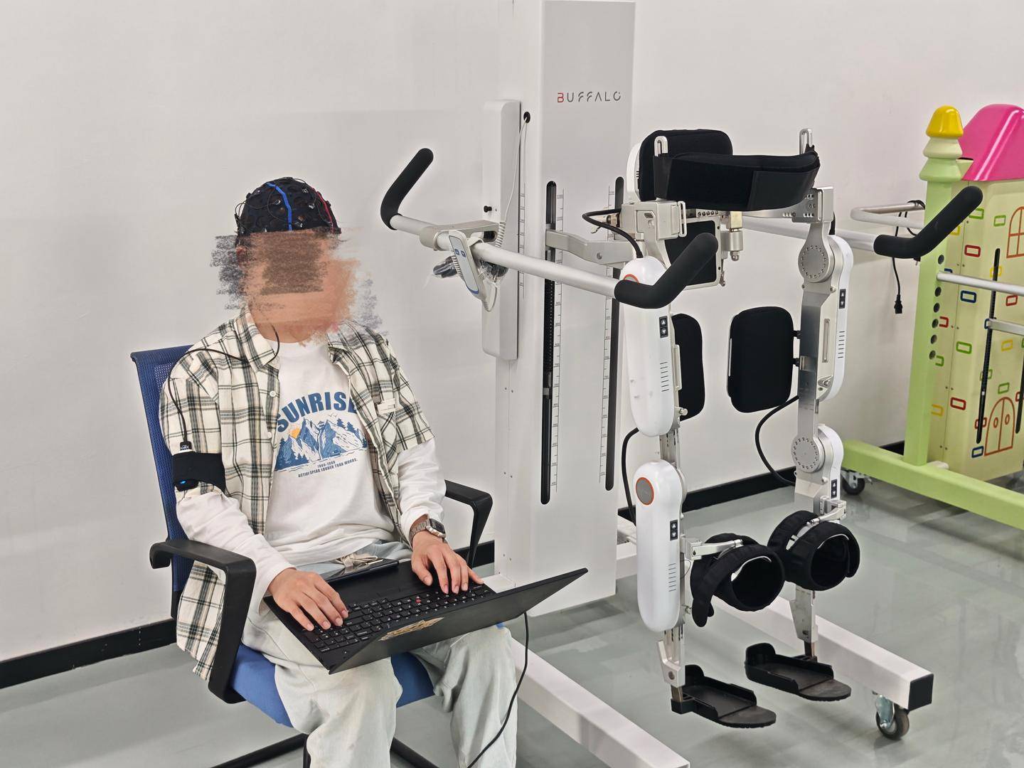 ▲脑机接口下肢外骨骼机器人,电子科技大学机器人研究中心脑机实验过程。布法罗机器人科技(成都)有限公司供图