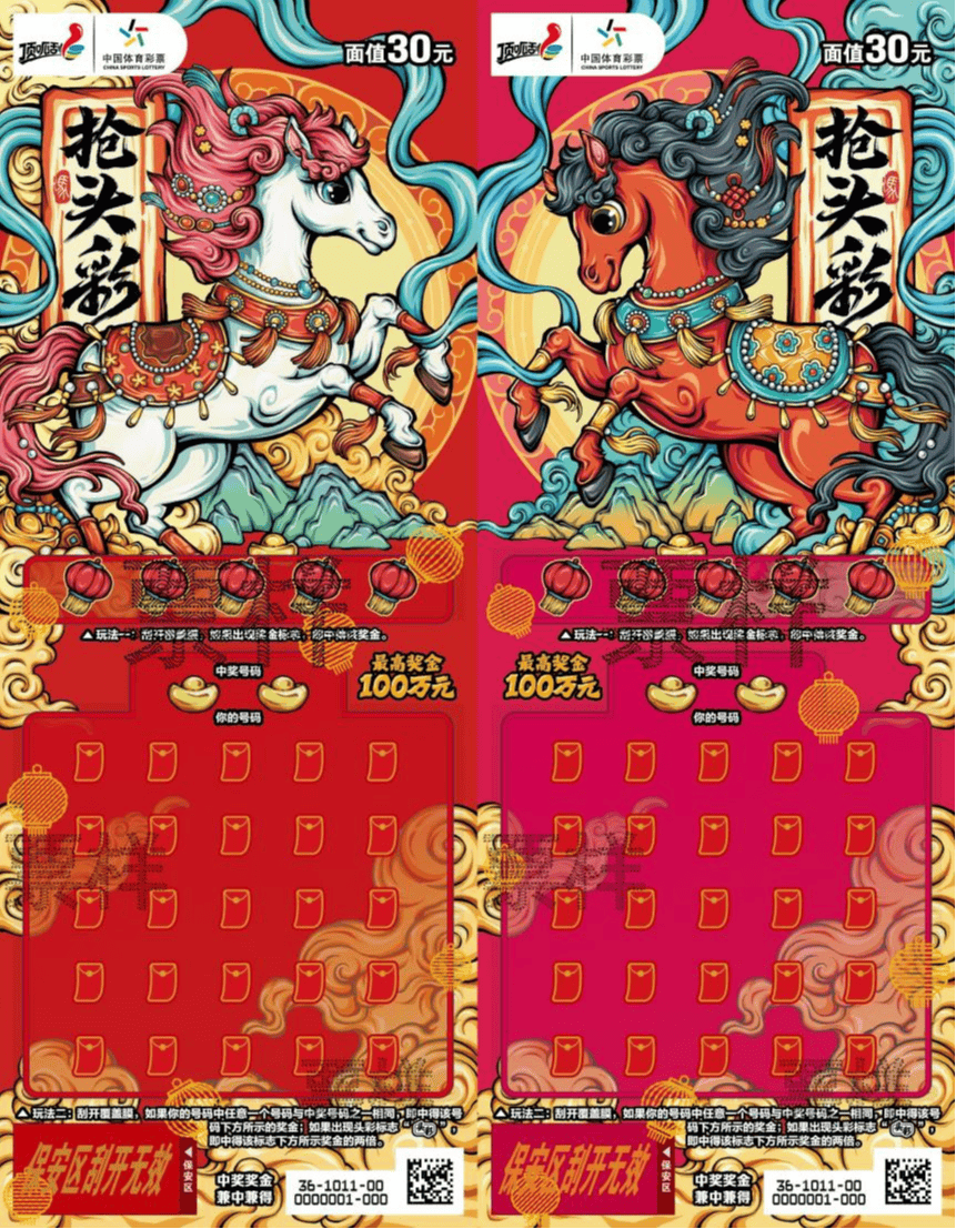30元面值的“抢头彩2026”,用鲜活色彩描绘两种形态的马驹,以昂扬的姿态祝福您新春开门红。
