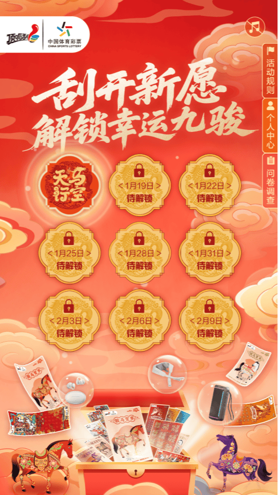 值此辞旧迎新之际,2026年的体彩新春季主题活动正式拉开帷幕。诚邀新老朋友共赴这场充满惊喜的新春之约,在欢声笑语中迎接崭新的一年!为了让新春的仪式感拉满,给广大市民增添乐趣与惊喜,2026年1月16日至2月11日体彩特别推出“刮开新愿解锁幸运九骏”H5活动,与你云端共度欢乐时光。