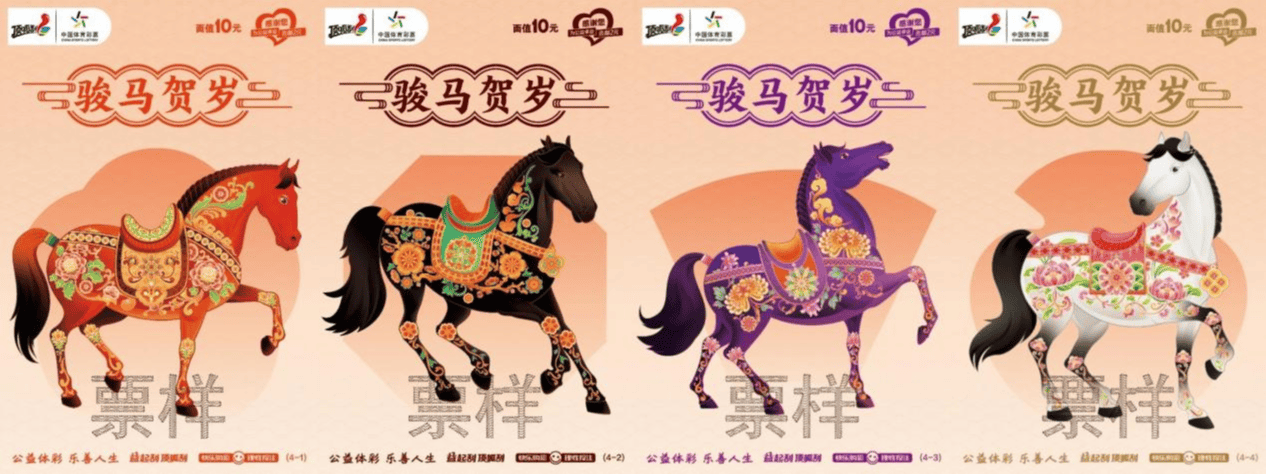 10元面值的“骏马贺岁”即开票,以历史名驹为灵感,搭配牡丹、如意等吉祥纹样,传递最简单线元面值的“骏马贺岁”(新疆尔自治区体育局体育彩票管理中心供图)