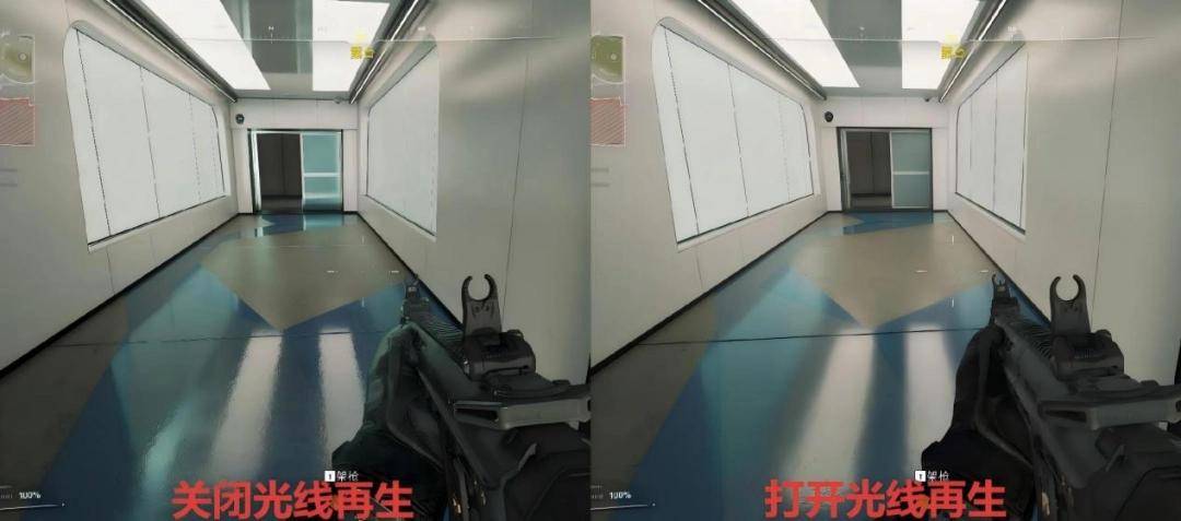 除了不同分辨率下的游戏测试外,这次我们还额外测试了这张华硕TUF RX9070XT O16G GAMING,在更新过AMD的FSR Redstone后,获得的游戏光追体验升级。以最早一批支持升级的《使命召唤:黑色行动7》为例,在游戏中启用FSR 4,关闭帧生成后,对比开启和关闭了FSR光线再生技术的一组游戏画面,可以明显看出在光照环境复杂的这片走廊内,右侧游戏画面的光线漫反射效果更加真实柔和,符合光线再生技术的宣传效果,整体画面观感更加舒适。