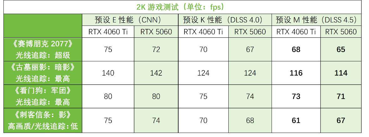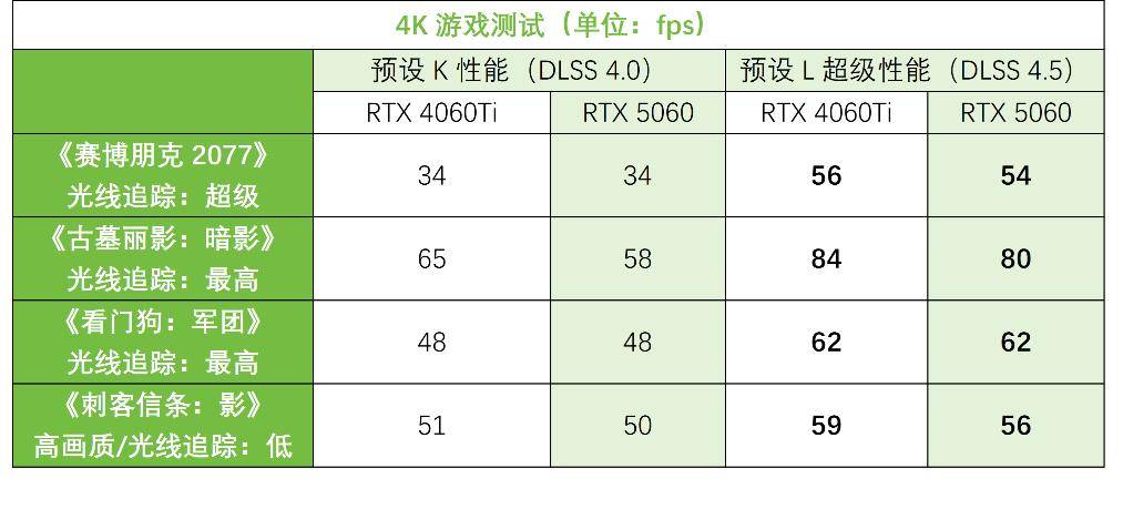 4K游戏测试中,我们没有专门去对比DLSS 4.5和传统CNN模型的效率表现,而是和DLSS 4.0进行对比。可以看到。无论是RTX 4060 Ti还是RTX 5060,使用预设L超级性能模式(DLSS 4.5)的游戏帧率都要比预设K性能模式(DLSS 4.0)更高,两款卡的平均帧率提升都在34%以上。