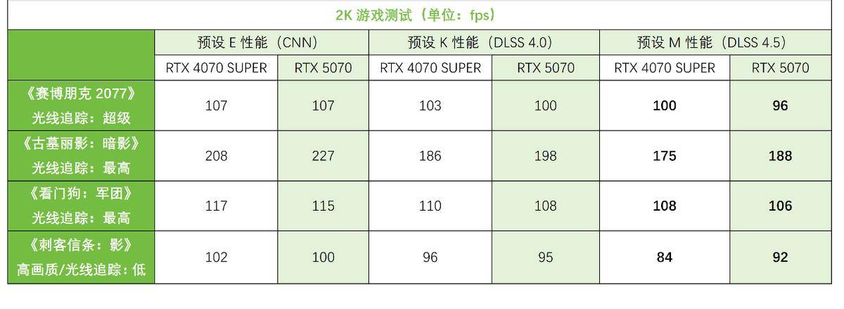 比较有意思的是,RTX 4070 SUPER和RTX 5070两款显卡的显存都是12GB,2K分辨率下基本可以排除“爆显存”的影响。在这个前提下,搭载新一代Tensor Core的RTX 5070开启DLSS 4.5后的效率表现几乎和RTX 4070 SUPER是一致的,相当于40系显卡可以“无痛”支持DLSS 4.5。