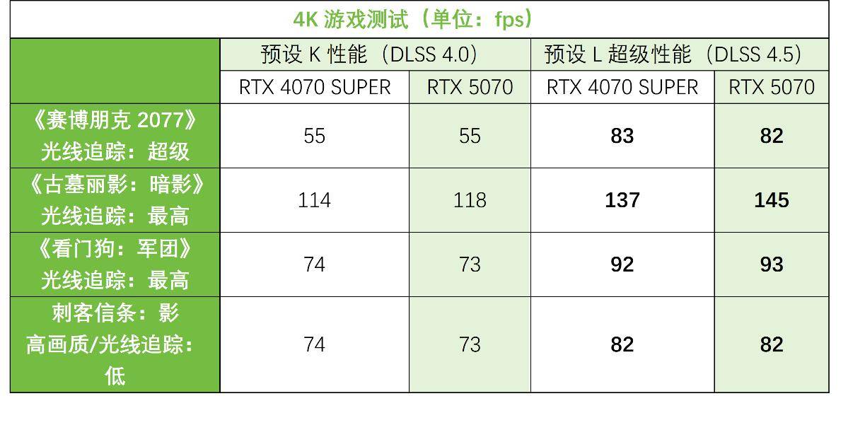 4K游戏分辨率下,RTX 4070 SUPER使用预设L超级性能模式的游戏帧率平均比预设K性能模式高27%左右,RTX 5070使用预设L超级性能模式的游戏帧率平均比预设K性能模式高28%左右。其中《赛博朋克2077》,在预设K性能模式下两款显卡的帧率都是55fps,使用预设L超级性能模式帧率可以达到80fps以上,提升还是很大。