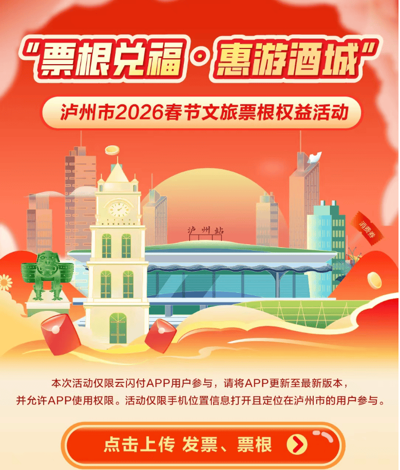 持有文旅类、交通类票根的在泸、来泸消费者,通过在酒城e购、云闪付平台上传消费发票等信息,可享受“满500减150”“满200减60”“满100减30”二次消费优惠。