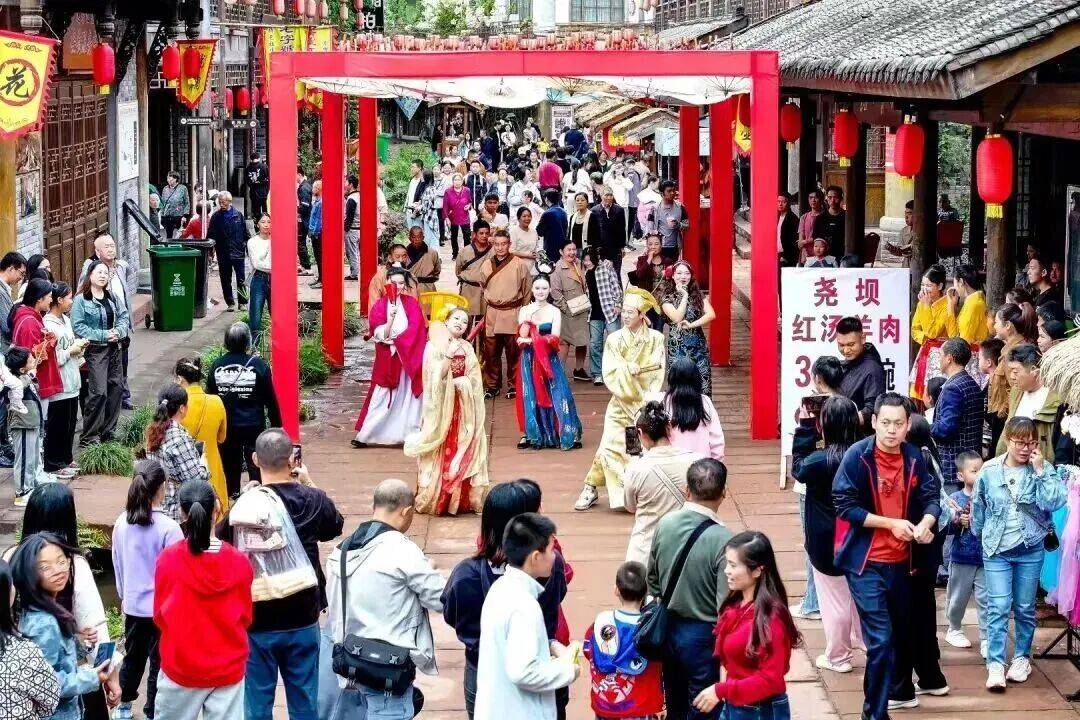 保留了电影《伟大的长征》拍摄实景,游客可沉浸式感受1935年红军四渡赤水的英雄历程。同时,还筹备了港风模仿秀、复古婚礼、川剧变脸、嗦面比赛、打陀螺、扔沙包、滚铁环,五路财神、复古舞队喜庆巡游,摔碗壮行沉浸式体验民俗乐趣,更有集粮票兑惊喜好礼,共赴烟火十足的复古新春之约。