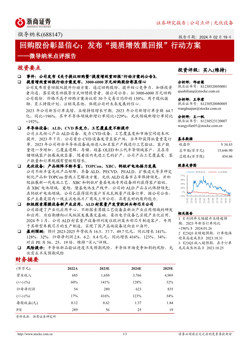 证券研究报告公司点评光伏设备 1/3微导纳米(688147) 报告日期:2024年02月19日 回购股份彰显信心;发布“提质增效重回报”行动方案 ——微导纳米点评报告 投资要点事件:公司发布《关于提议回购暨提质增效重回报行动方案的公告》。